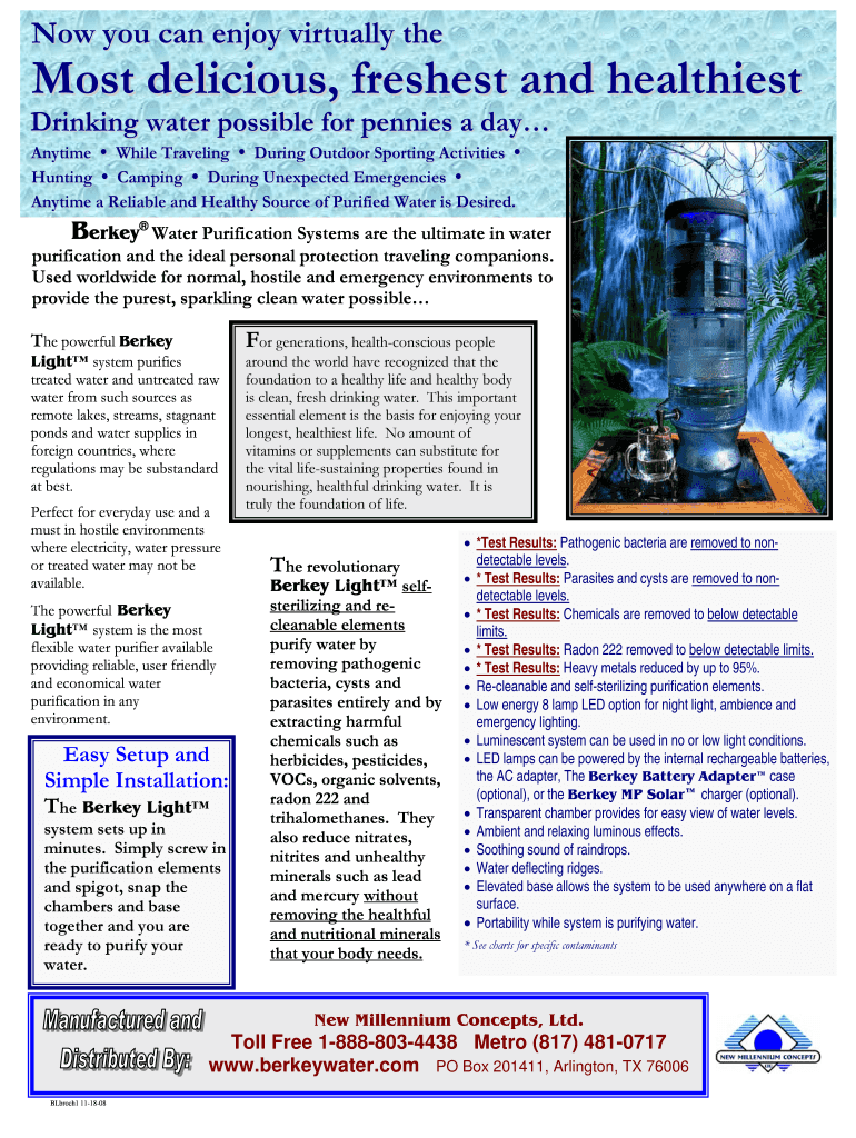 Now you can enjoy virtually the Most delicious, freshest and healthiest Drinking water possible for pennies a day Anytime y While Traveling y During Outdoor Sporting Activities y Hunting y Camping