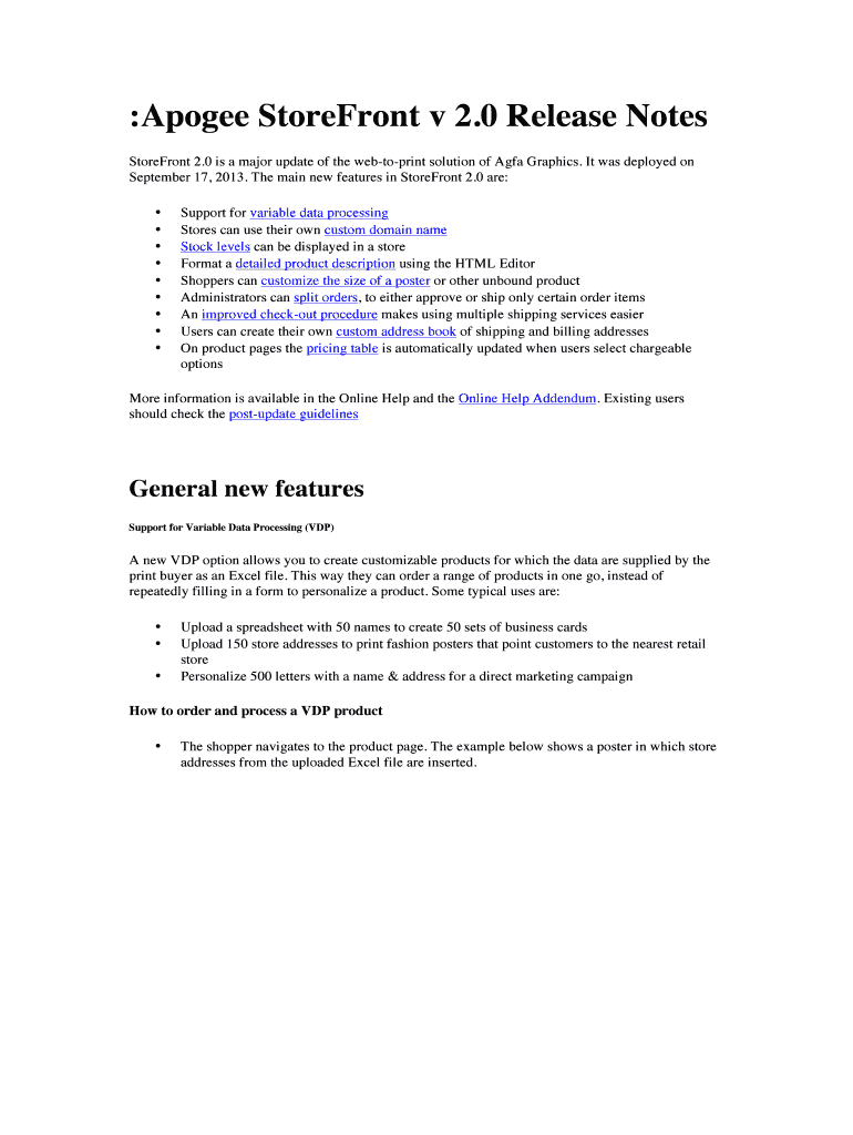 Apogee Storefront v 2.0 Release Notes Storefront 2.0 is a major update of the bioprint solution of Agra Graphics. It was deployed on September 17, 2013. The main new features in Storefront 2.0 are: