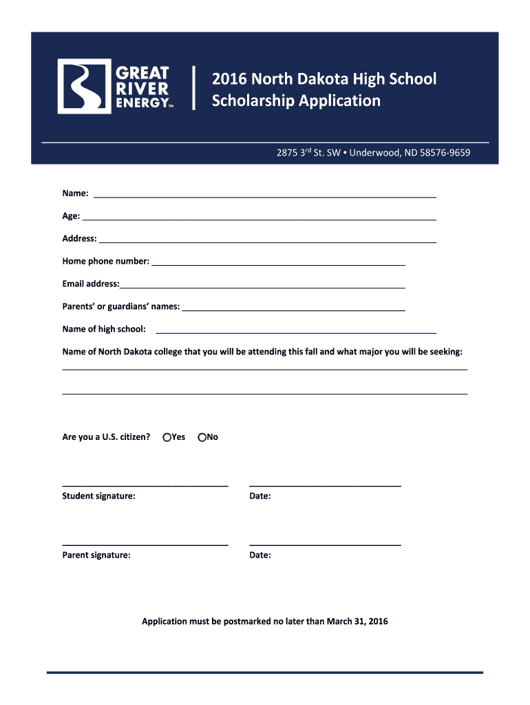 2016 North Dakota High School Scholarship Application 2875 3rd St. SW Underwood, ND 58576 9659 Name: Age: Address: Home phone number: Email address: Parents or guardians names: Name of high school: