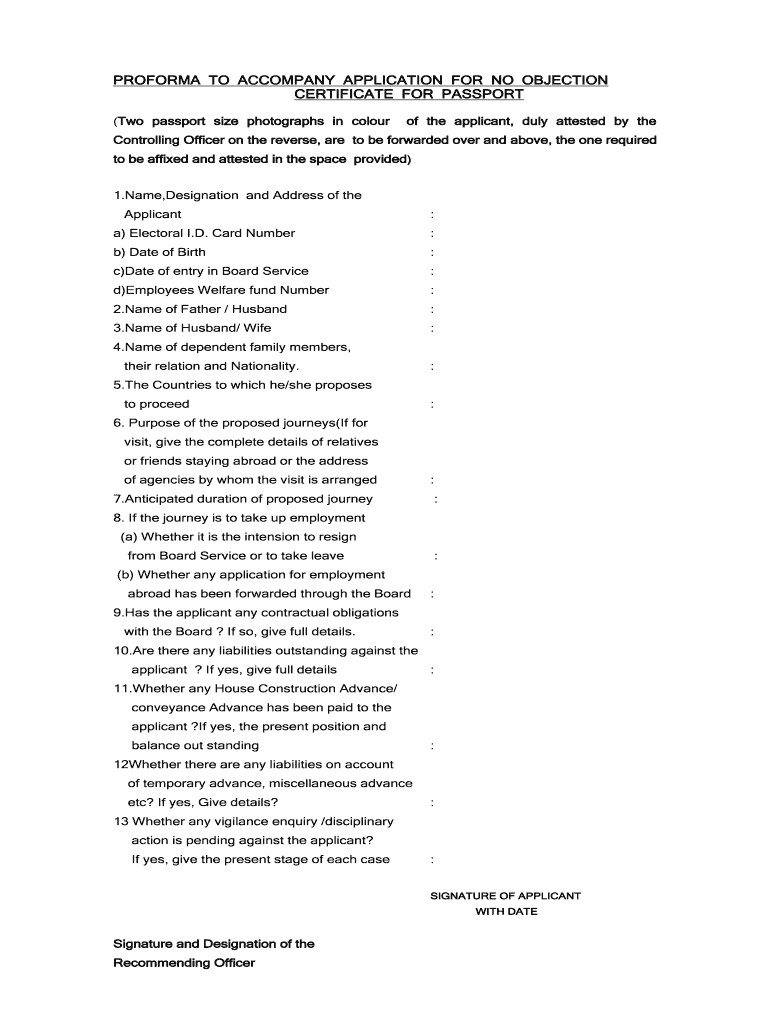PROFORMA TO ACCOMPANY APPLICATION FOR NO OBJECTION