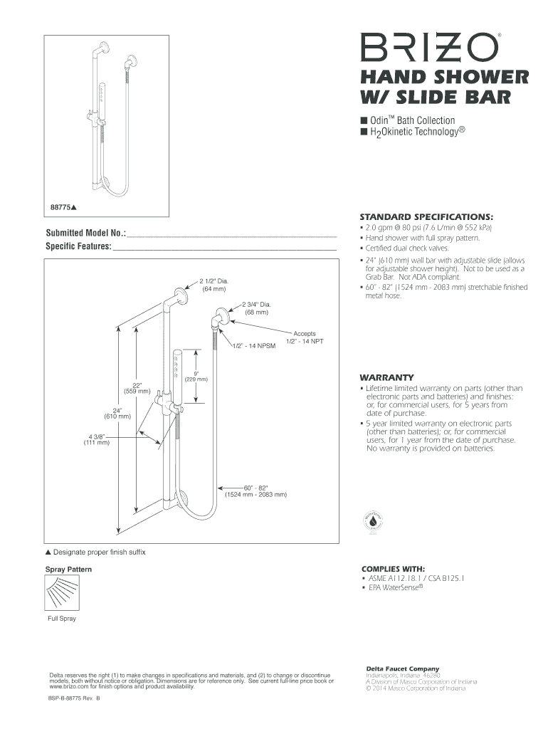 HAND SHOWER W/ SLIDE BAR n Odin Bath Collection n H2Okinetic Technology 88775 STANDARD SPECIFICATIONS: Submitted Model No.: Specific Features: 2 1×2 Did. (64 mm) 2 3×4 Did. (68 mm) 1×2 14 NPS 22
