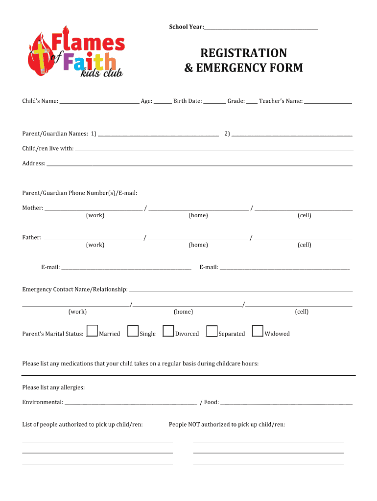 School Year: REGISTRATION & EMERGENCY FORM Child's Name: Age: Birth Date: Grade: Teachers Name: Parent×Guardian Names: 1× 2) Child×men live with: Address: Parent×Guardian Phone Number’s)/Email: