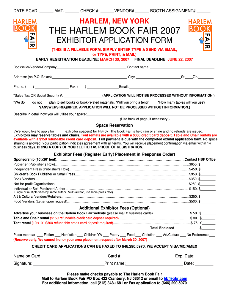 DATE RCD: AMT. CHECK #: VENDOR# BOOTH ASSIGNMENT# HARLEM, NEW YORK THE HARLEM BOOK FAIR 2007 EXHIBITOR APPLICATION FORM (THIS IS A FILLABLE FORM. SIMPLY ENTER TYPE & SEND VIA EMAIL, or TYPE, PRINT,