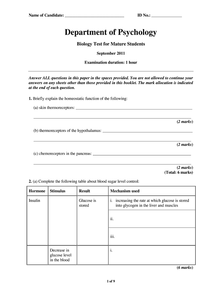Name of Candidate: ID No.: Department of Psychology Biology Test for Mature Students September 2011 Examination duration: 1 hour Answer ALL questions in this paper in the spaces provided. You are
