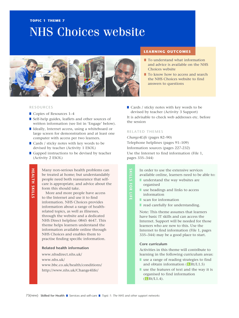 TO P I C 1 T H E M E 7 NHS Choices website LEARNING OUTCOMES To understand what information and advice is available on the NHS Choices website To know how to access and search the NHS Choices website