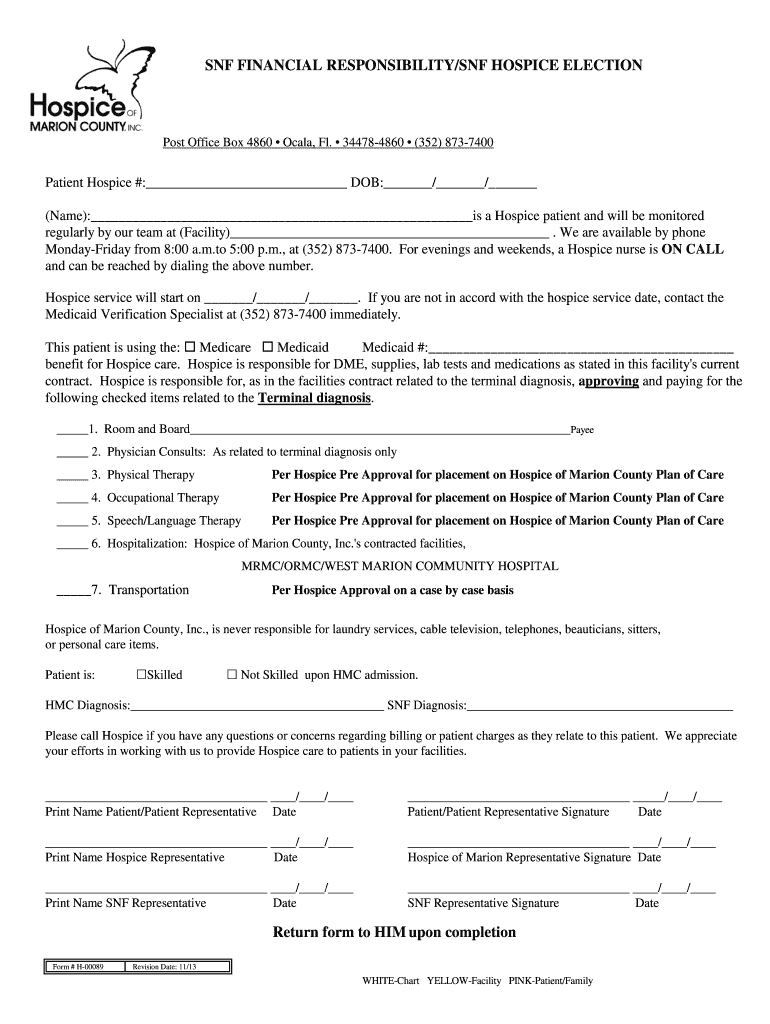 SNF FINANCIAL RESPONSIBILITY×SNF HOSPICE ELECTION Post Office Box 4860 Ocala, Fl. 344784860 ×352× 8737400 Patient Hospice #: DOB: / / (Name): is a Hospice patient and will be monitored regularly
