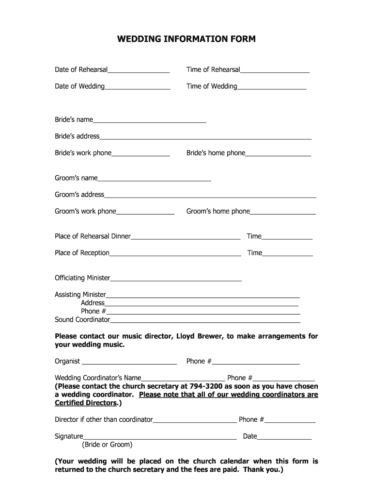 Get the free WEDDING INFORMATION FORM - bcayceumcbbcomb