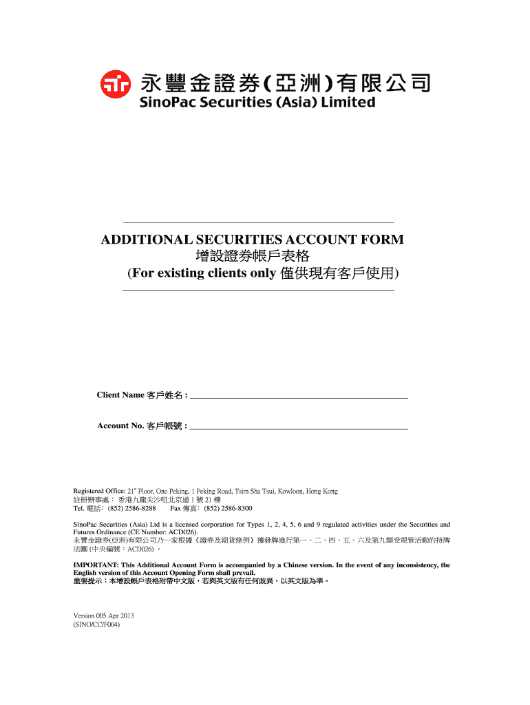 ADDITIONAL SECURITIES ACCOUNT FORM (For existing clients only) Client Name : Account No. Registered Office: 21st Floor, One Peking, 1 Peking Road, Trim SHA Sui, Kowloon, Hong Kong 1 21 Tel. (852)