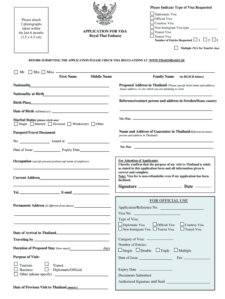 This form allows applications for Diplomatic Visa, Official Visa, Non-Immigrant Visa, Tourist Visa, and Transit Visa to Thailand.