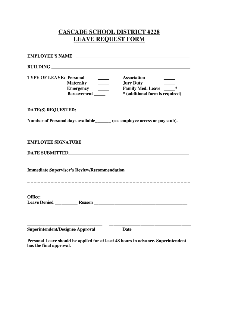 CASCADE SCHOOL DISTRICT #228 LEAVE REQUEST FORM EMPLOYEES NAME BUILDING TYPE OF LEAVE: Personal Maternity Emergency Bereavement Association Jury Duty Family Med. Leave * * (additional form is required)