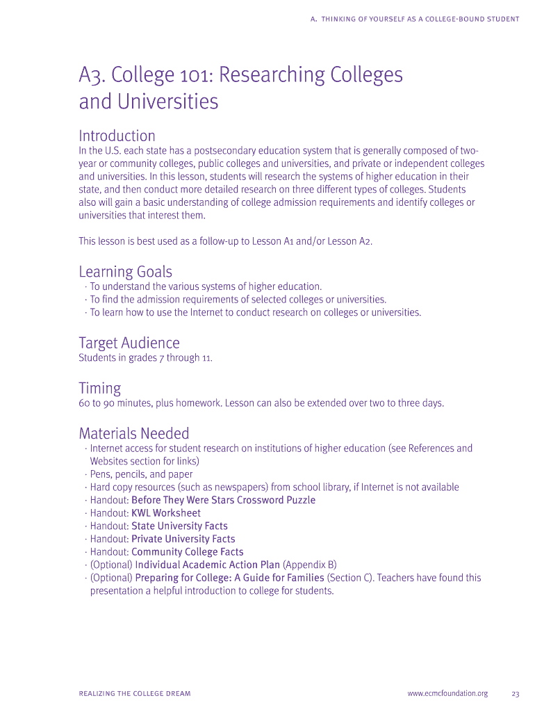 A. Thinking of yourself as a college bound student A3. College 101: Researching Colleges and Universities Introduction In the U.S. each state has a postsecondary education system that is generally