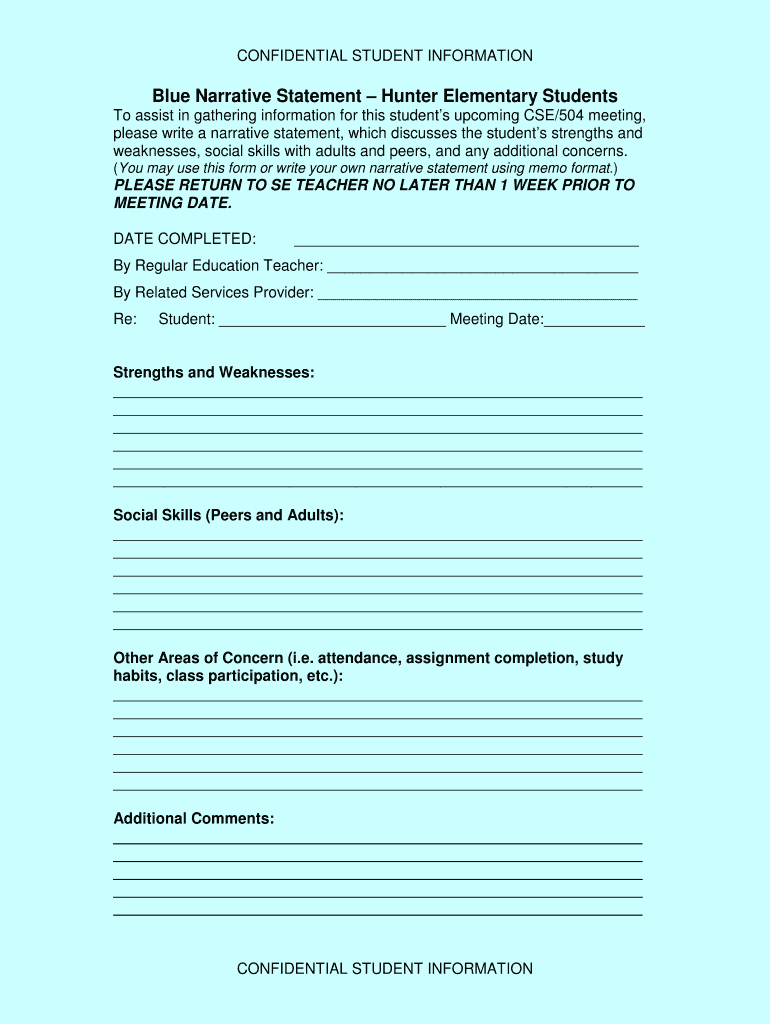 CONFIDENTIAL STUDENT INFORMATION Blue Narrative Statement Hunter Elementary Students To assist in gathering information for these students upcoming CSE×504 meeting, please write a narrative statement,
