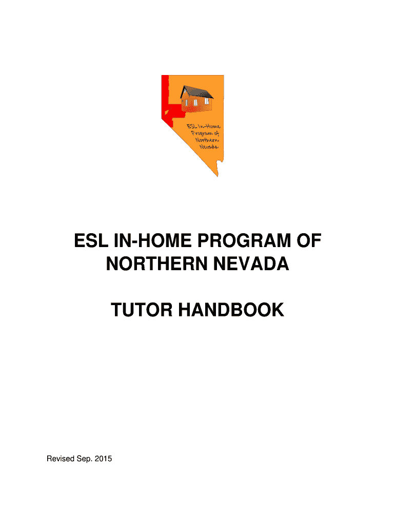 ESL INCOME PROGRAM OF NORTHERN NEVADA TUTOR HANDBOOK Revised Sep. 2015 TABLE OF CONTENTS GENERAL INFORMATION Welcome ESL Contact Details Organization Information ESL Mission Statement 1 Tutor Job