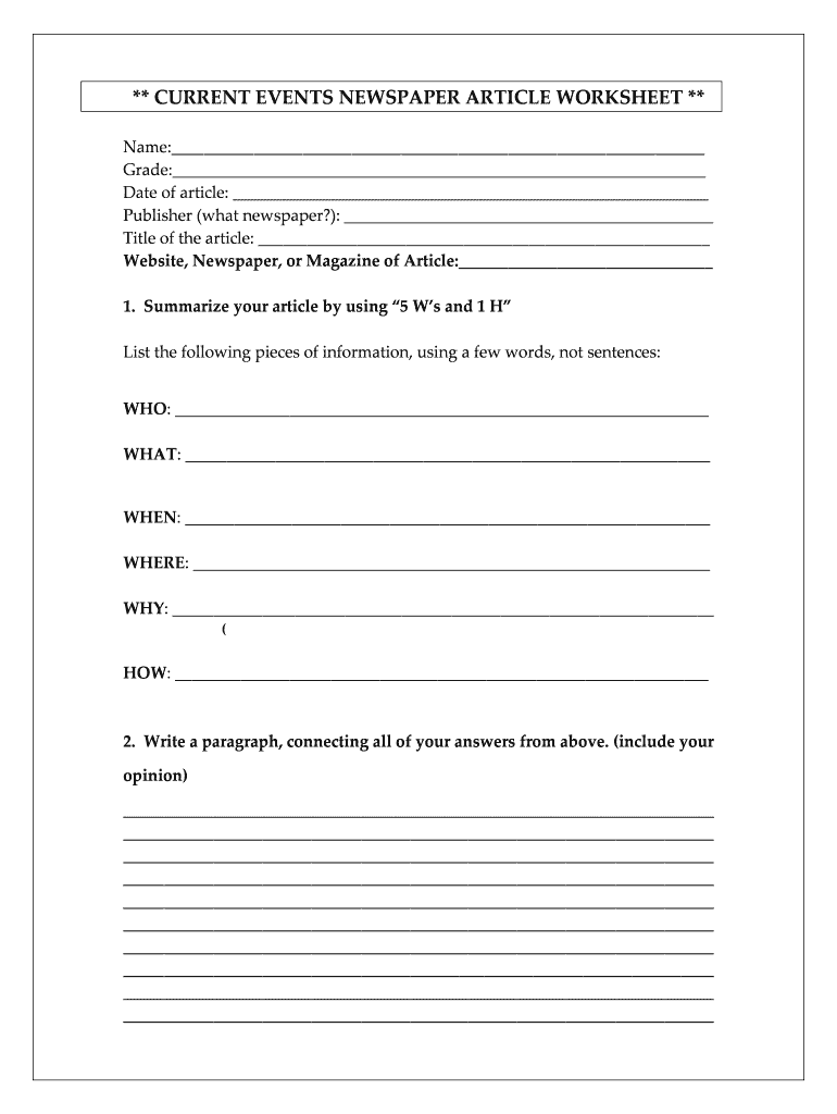 ** CURRENT EVENTS NEWSPAPER ARTICLE WORKSHEET ** Name: Grade: Date of article: Publisher (what newspaper?): Title of the article: Website, Newspaper, or Magazine of Article: 1. Summarize your article