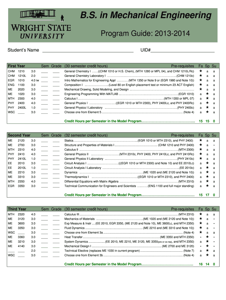 B.S. in Mechanical Engineering Program Guide: 20132014 Students Name First Year SEM Grade (30 semester credit hours) UID# Prerequisites PHY 2400L 1.0 General Physics I Laboratory.×PHY 2400c) WSC
