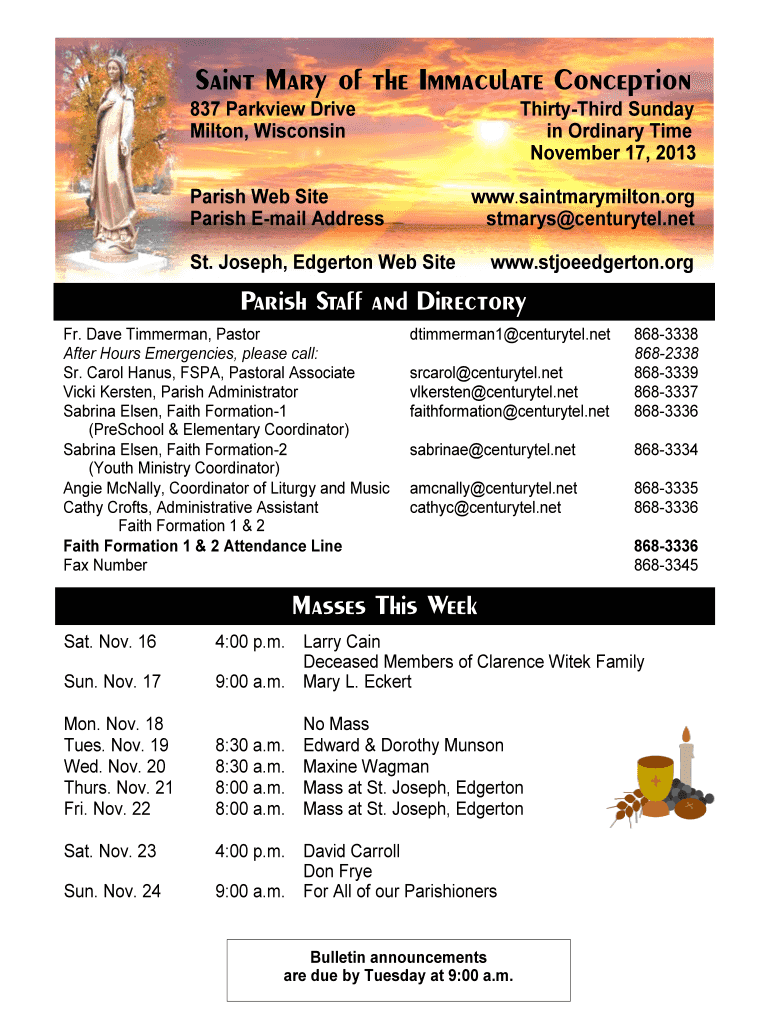 Saint Mary of the Immaculate Conception 837 Park view Drive Milton, Wisconsin ThirtyThird Sunday in Ordinary Time November 17, 2013, Parish Website Parish Email Address www.saintmarymilton.org stars