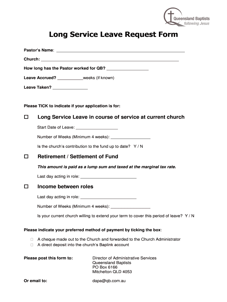 Long Service Leave Request Form Pastors Name: Church: How long has the Pastor worked for QB? Leave Accrued? Weeks (if known) Leave Taken? Please TICK to indicate if your application is for: Long Service