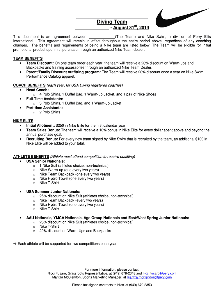 Diving Team st August 31, 2014, This document is an agreement between (The Team) and Nike Swim, a division of Perry Ellis International. This agreement will remain in effect throughout the entire