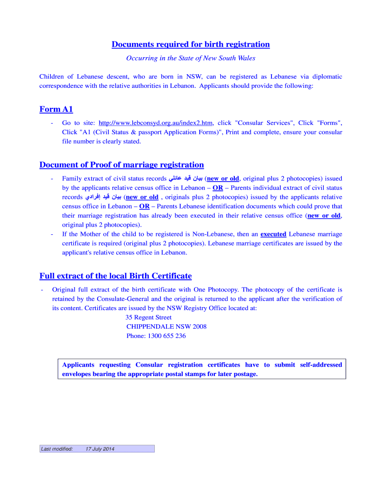 Documents required for birth registration Occurring in the State of New South Wales Children of Lebanese descent, who are born in NSW, can be registered as Lebanese via diplomatic correspondence with