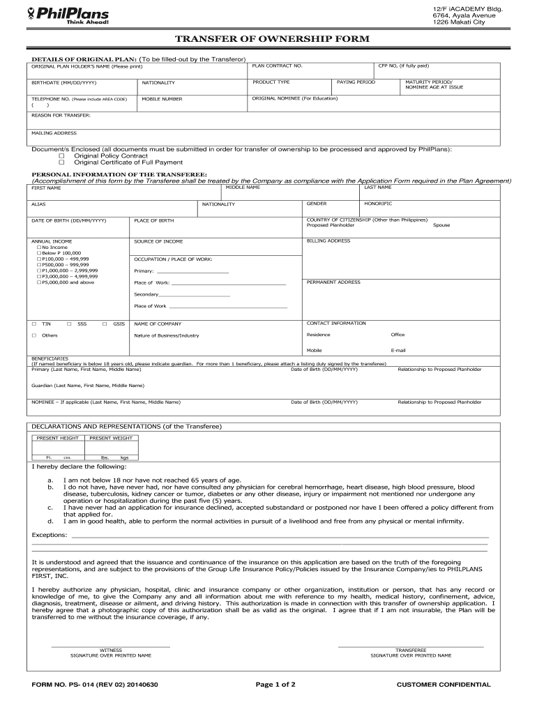 12×F academy Bldg. 6764, Ayala Avenue 1226 Marathi City TRANSFER OF OWNERSHIP FORM DETAILS OF ORIGINAL PLAN: (To be filled out by the Transferor) ORIGINAL PLAN HOLDERS NAME (Please print) PLAN CONTRACT