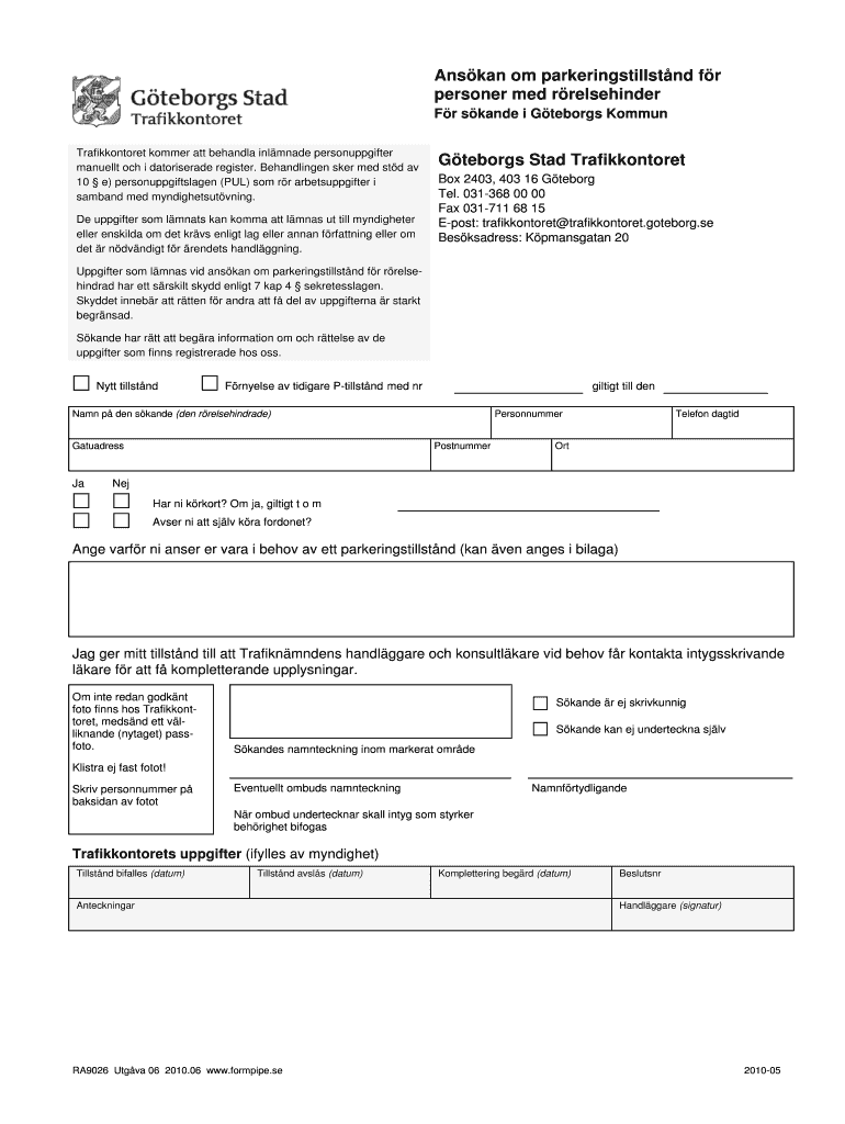 Anshan on parkeringstillstnd for person her med rrelsehinder For Skåne i Goteborg Common Trafikkontoret former ATT rehandle inland personuppgifter Manuel och i datoriserade register. Rehandling skier