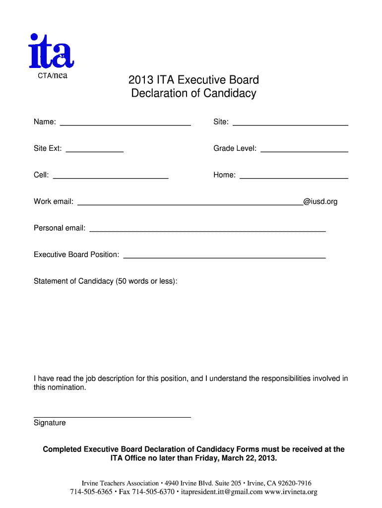 CTA×NEA 2013 ITA Executive Board Declaration of Candidacy Name: Site: Site Ext: Grade Level: Cell: Home: Work email: IUD.org Personal email: Executive Board Position: Statement of Candidacy (50 words