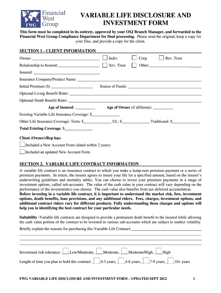 PRINT FORM CLEAR FORM VARIABLE LIFE DISCLOSURE AND INVESTMENT From This form must be completed in its entirety, approved by your OSI Branch Manager, and forwarded to the Financial West Group Compliance