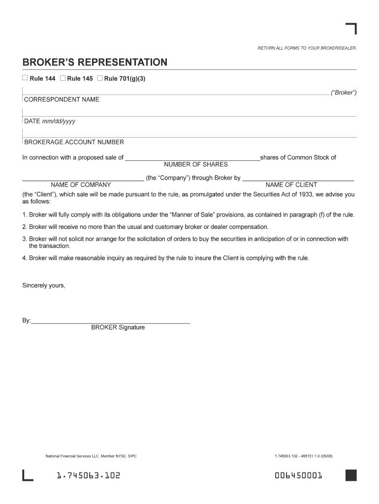 RETURN ALL FORMS TO YOUR BROKER×DEALER. BROKERS REPRESENTATION Rule 144 Rule 145 Rule 701×g)(3) (Broker) CORRESPONDENT NAME DATE mm×dd/YYY BROKERAGE ACCOUNT NUMBER In connection with a proposed