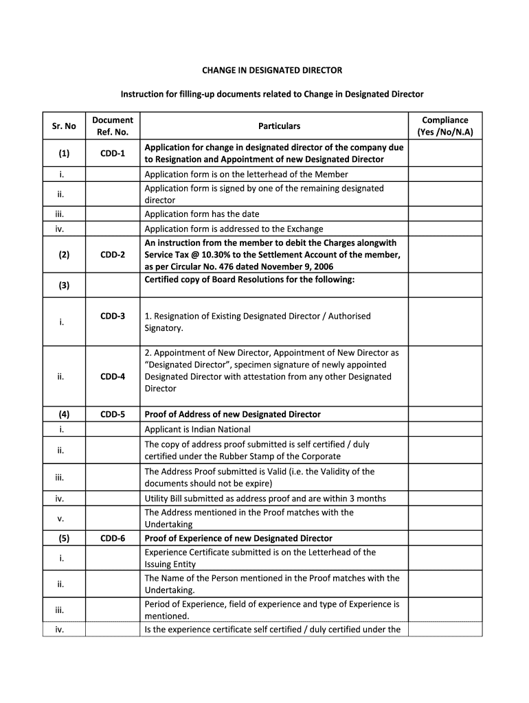 Sr. No (1) CHANGEINDESIGNATEDDIRECTOR InstructionforfillingupdocumentsrelatedtoChangeinDesignatedDirector Document Compliance Particulars (Yes×No/N. A) Ref.No. Applicationforchangeindesignateddirectorofthecompanydue