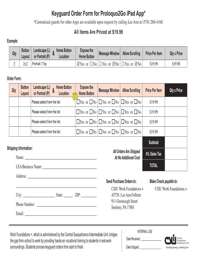 Key guard Order Form for Proloquo2Go iPad App* *Customized guards for other Apps are available upon request by calling Lee Ann at (570× 2864168. All Items Are Priced at $19.99 Example: Button Landscape