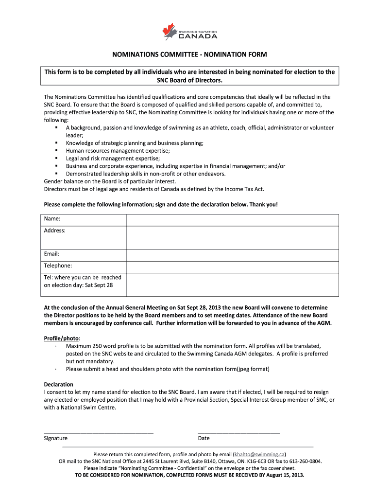 NOMINATIONS COMMITTEE NOMINATION FORM This form is to be completed by all individuals who are interested in being nominated for election to the SNC Board of Directors. The Nominations Committee has