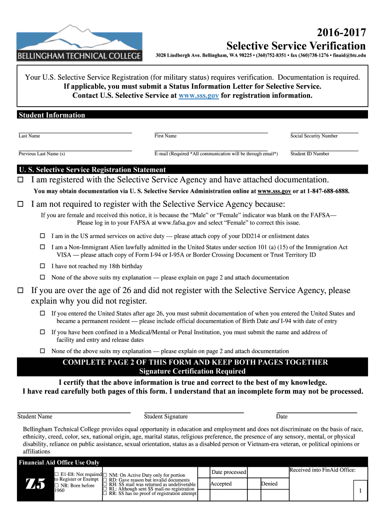 20162017 Selective Service Verification 3028 Lindbergh Ave. Bellingham, WA 98225 ×360×7528351 fax (360×7381276 fin aid BTC.edu Your U.S. Selective Service Registration (for military status) requires