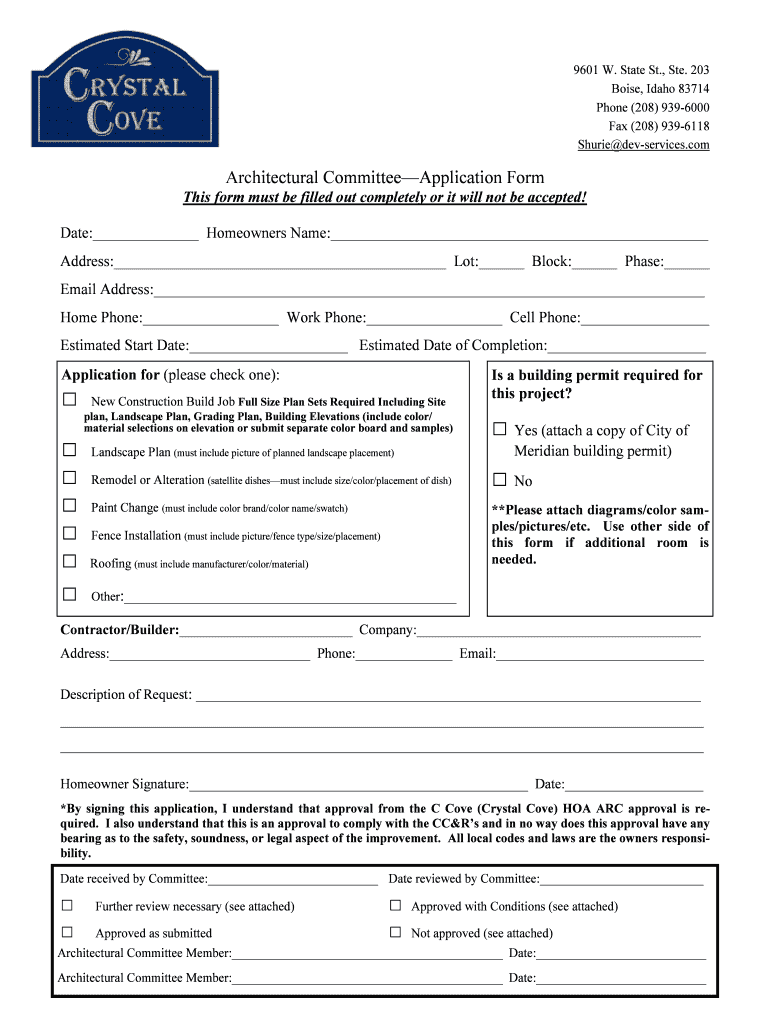 The Architectural Committee—Application Form must report information such as the homeowner's details, description of proposed changes, site plans, materials to be used, and the timeline for completion.