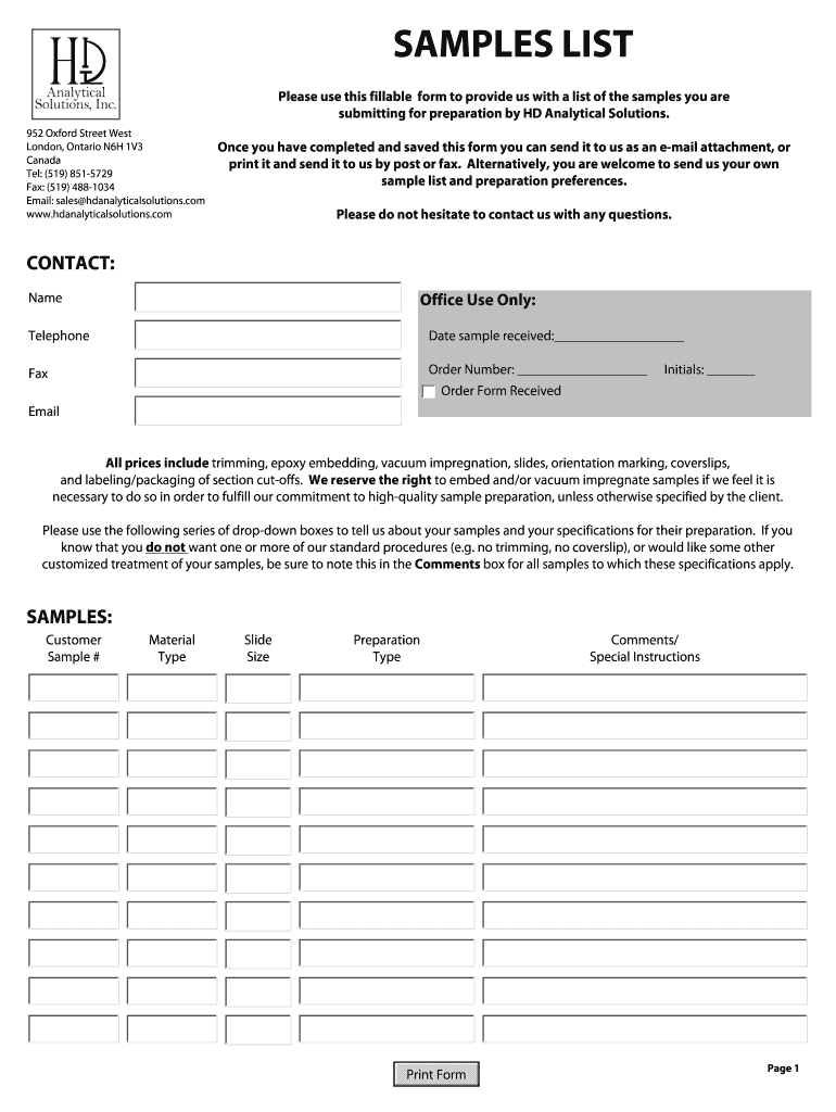 SAMPLES LIST Please use this fillable form to provide us with a list of the samples you are submitting for preparation by HD Analytical Solutions. 952 Oxford Street West London, Ontario N6H 1V3 Canada