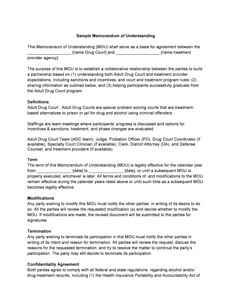 Sample Memorandum of Understanding This Memorandum of Understanding (YOU) shall serve as a basis for agreement between the name Drug Court and name treatment provider agency. The purpose of this YOU