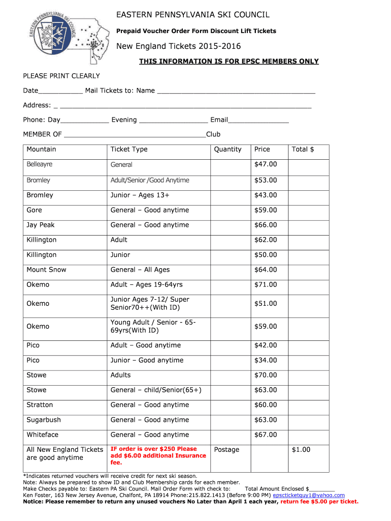 EASTERN PENNSYLVANIA SKI COUNCIL Prepaid Voucher Order Form Discount Lift Tickets New England Tickets 20152016 THIS INFORMATION IS FOR EPIC MEMBERS ONLY PLEASE PRINT CLEARLY Date Mail Tickets to: