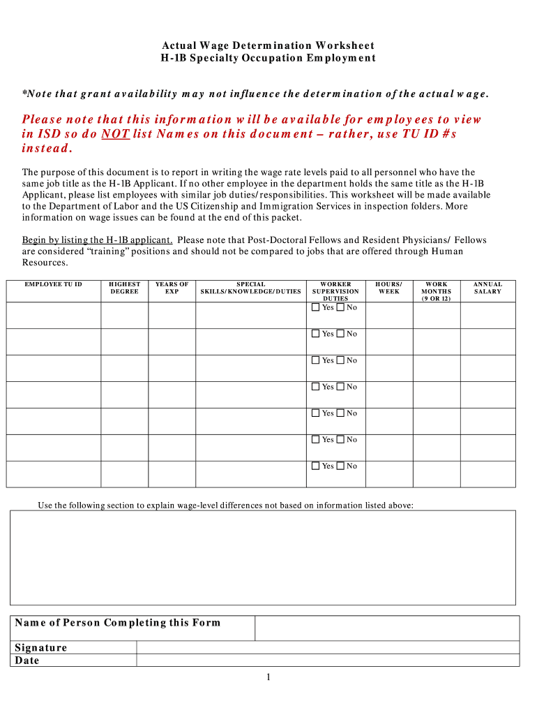 Actual Wage Determination Worksheet H1B Specialty Occupation Employment *Note that grant availability may not influence the determination of the actual wage. Please note that this information will