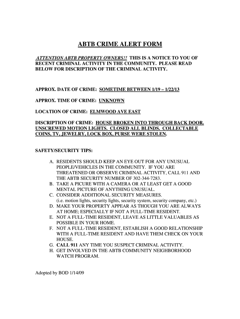 ABB CRIME ALERT FORM ATTENTION ABB PROPERTY OWNERS!! THIS IS A NOTICE TO YOU OF RECENT CRIMINAL ACTIVITY IN THE COMMUNITY. PLEASE READ BELOW FOR DESCRIPTION OF THE CRIMINAL ACTIVITY. APPROX. DATE