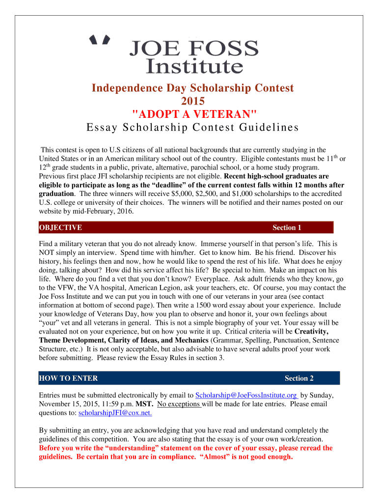 Independence Day Scholarship Contest 2015 “ADOPT A VETERAN Essay Scholarship Contest Guidelines This contest is open to U.S. citizens of all national backgrounds that are currently studying in the