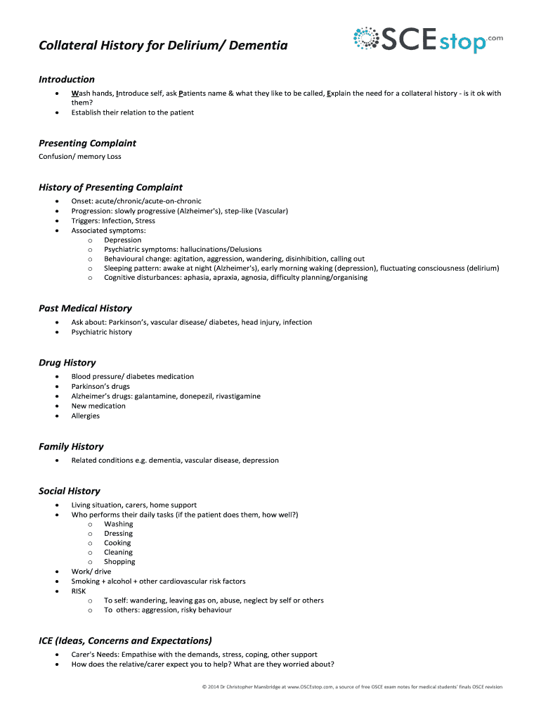 Get the free Collateral History for Delirium/ Dementia