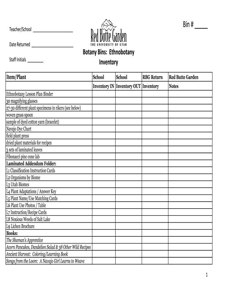Bin # Teacher×School Date Returned Staff Initials Botany Bins: Ethnobotany Inventory Item×Plant School RBG Return Inventory IN Inventory OUT Inventory Red Butte Garden Notes Ethnobotany Lesson Plan