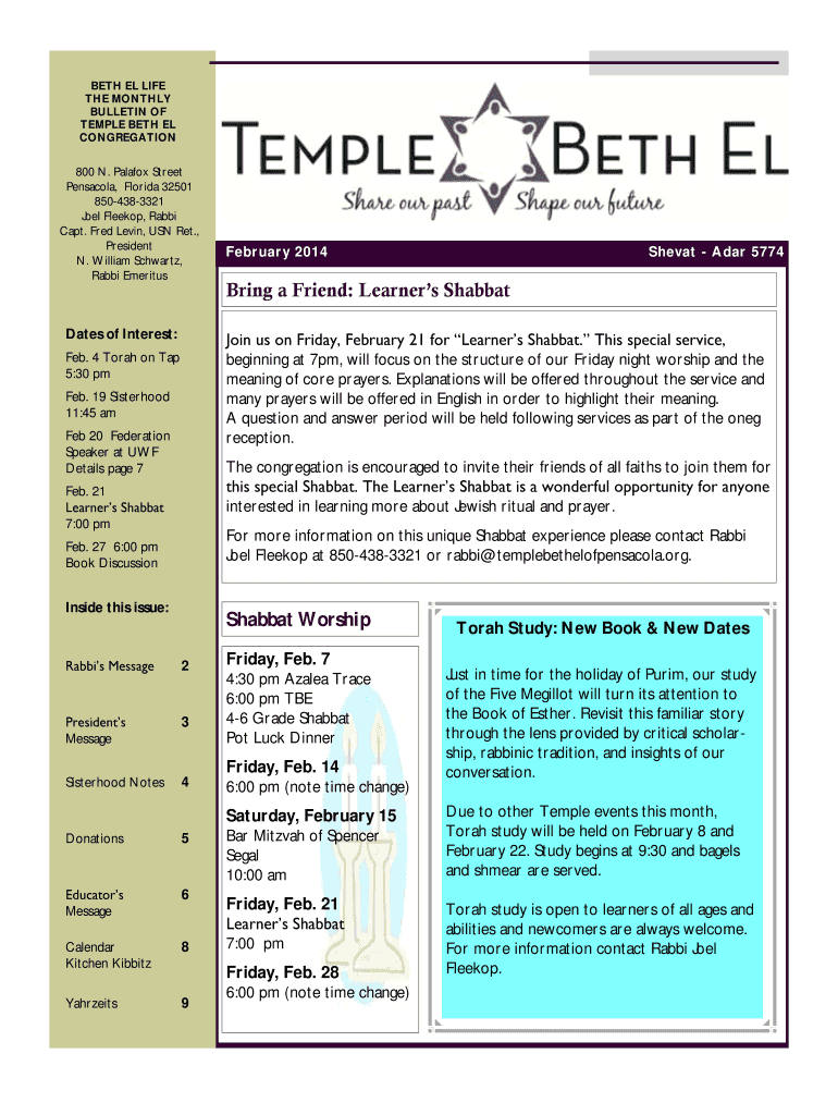 BETH EL LIFE THE MONTHLY BULLETIN OF TEMPLE BETH EL CONGREGATION 800 N. Paradox Street Pensacola, Florida 32501 8504383321 Joel Fleet, Rabbi Capt. Fred Kevin, USN RET., President N. William Schwartz,