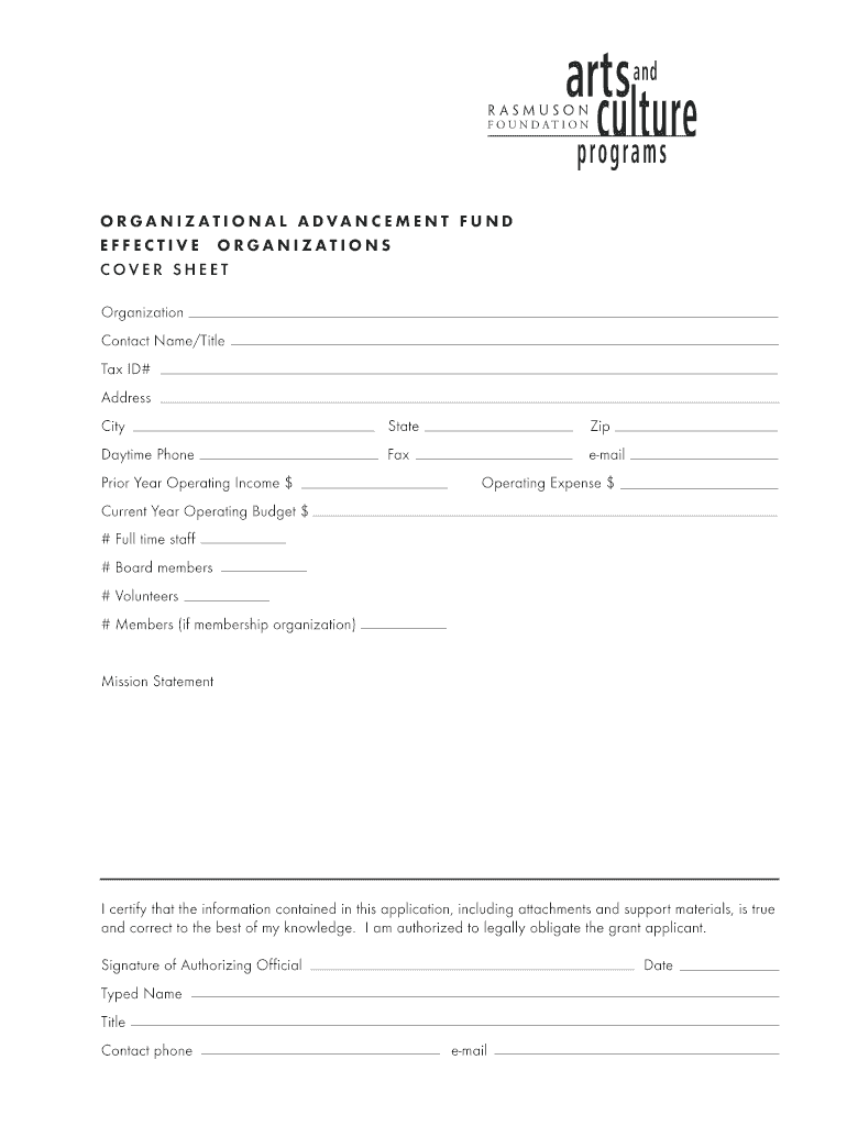 O R GA N I Z AT I O N A L A DVA N C E M E N T F U N D EFFECTIVE ORGANIZATIONS COVER SHEET Organization Contact Name×Title Tax ID# Address City State Zip Daytime Phone Fax email Prior Year Operating