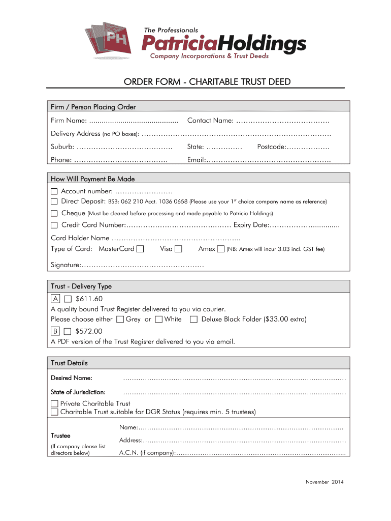 ORDER FORM CHARITABLE TRUST DEED Firm / Person Placing Order Firm Name: ........................................... Contact Name: Delivery Address (no PO boxes):. Suburb:. State: Postcode: Phone: