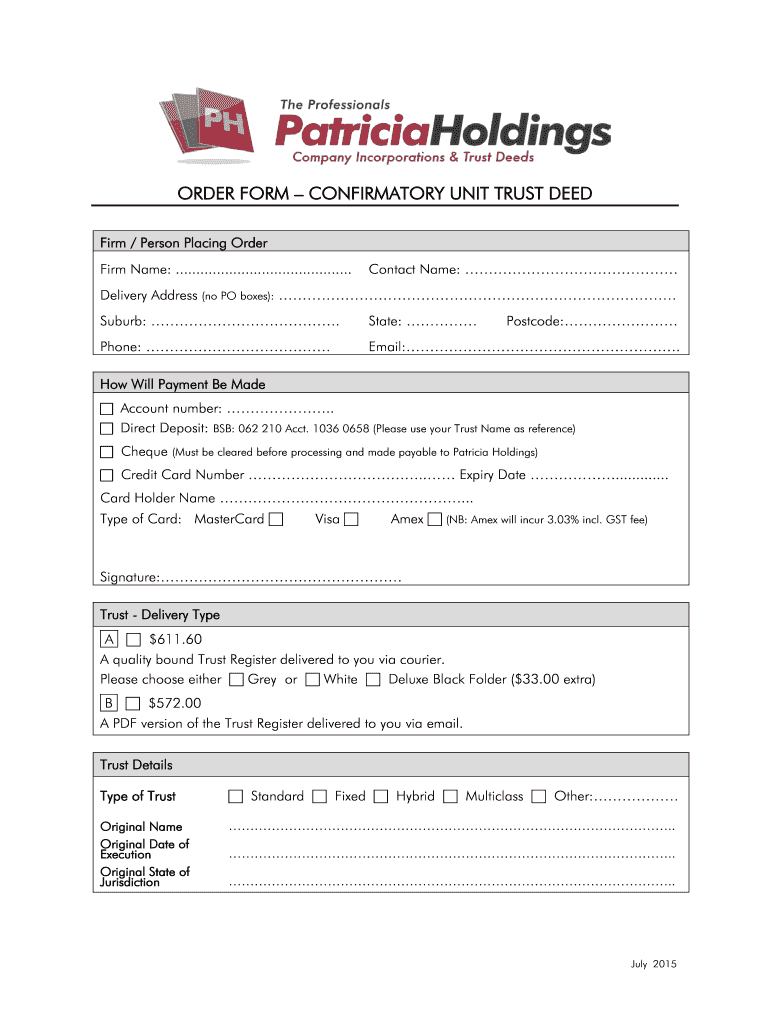 ORDER FORM CONFIRMATORY UNIT TRUST DEED Firm / Person Placing Order Firm Name: ........................................... Contact Name: Delivery Address (no PO boxes): Suburb:. State: Postcode: Phone: