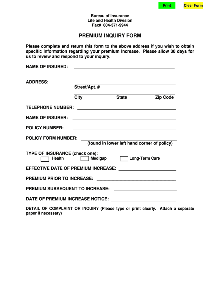 The Virginia Health Insurance Premium Inquiry Form itself does not have a submission fee, but check with the Bureau of Insurance for any applicable fees based on specific requests or additional forms.
