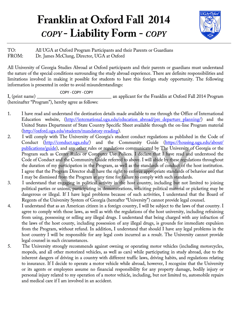 Franklin at Oxford Fall 2014 COPY Liability Form COPY TO: FROM: All UGA at Oxford Program Participants and their Parents or Guardians Dr. James McClung, Director, UGA at Oxford All University of Georgia