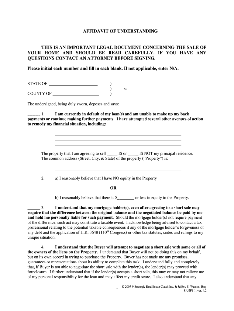 AFFIDAVIT OF UNDERSTANDING THIS IS AN IMPORTANT LEGAL DOCUMENT CONCERNING THE SALE OF YOUR HOME AND SHOULD BE READ CAREFULLY. IF YOU HAVE ANY QUESTIONS CONTACT AN ATTORNEY BEFORE SIGNING. Please initial