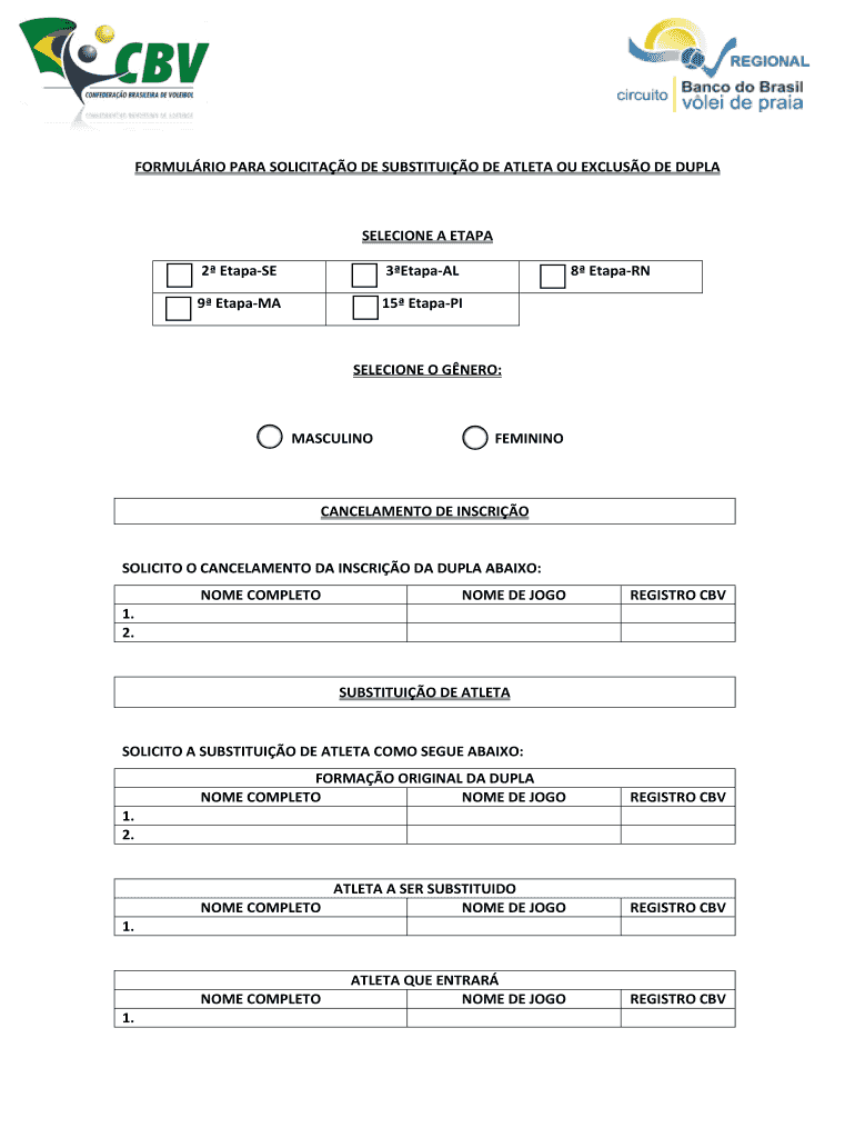 Obtenha o gratuito FORMULRIO PARA SOLICITAO DE SUBSTITUIO DE ATLETA OU EXCLUSO DE DUPLA