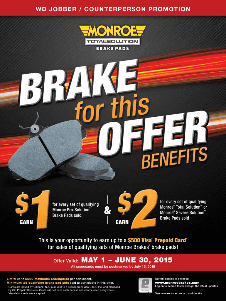 W D J ROBBER / COU N TE RPE RSO N PRO M O TO N for every set of qualifying Monroe Resolution Brake Pads sold; for every set of qualifying Monroe Total Solution or Monroe Severe Solution Brake Pads